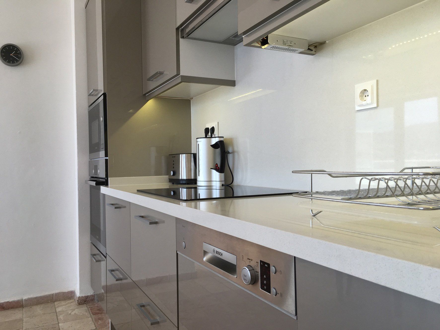 Number Two Komurluk features quirky, contemporary and spacious living space spread over two floors, with fabulous uninterrupted town, sea and harbour views from every room. Upstairs there are two spacious bedrooms accommodating 4 people (both with superb sea views), the master with a kingsize bed and a twin room with two single beds. Both have en suite marble and travertine bathrooms, safety deposit boxes, hairdryers, alarm clocks and plenty of storage space. Fresh bed linen and bathroom towels are provided. Downstairs there is a further WC/utility room housing a washing machine, iron etc and a large open plan kitchen/dining area adjacent to a comfortable lounge area with two sofas. The kitchen features fully integrated Bosch appliances, including a microwave and dishwasher. There is also free Wi-Fi, TV channels via an Amazon Firestick, a DVD player and a bluetooth speaker for music.