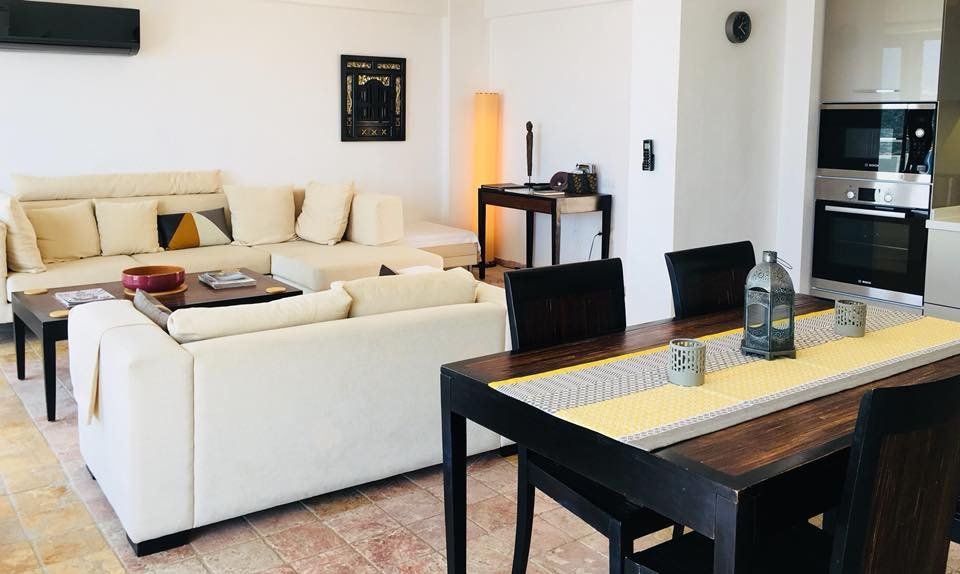 Number Two Komurluk features quirky, contemporary and spacious living space spread over two floors, with fabulous uninterrupted town, sea and harbour views from every room. Upstairs there are two spacious bedrooms accommodating 4 people (both with superb sea views), the master with a kingsize bed and a twin room with two single beds. Both have en suite marble and travertine bathrooms, safety deposit boxes, hairdryers, alarm clocks and plenty of storage space. Fresh bed linen and bathroom towels are provided. Downstairs there is a further WC/utility room housing a washing machine, iron etc and a large open plan kitchen/dining area adjacent to a comfortable lounge area with two sofas. The kitchen features fully integrated Bosch appliances, including a microwave and dishwasher. There is also free Wi-Fi, TV channels via an Amazon Firestick, a DVD player and a bluetooth speaker for music.
